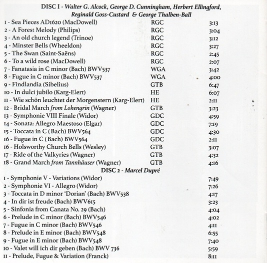Since 1930, Marcel Dupré has made many recordings, especially at the Alexandra Palace organ in London. It can be heard in works by Bach (Toccata in D Minor [Dorian], Chorales, Sinfonia from Cantata No.29, Prelude and Fugue in C Minor, Prelude and Fugue in E Minor), Franck (Prélude, Fugue et Variation) and Widor (Variations from Symphonie nº5, Allegro from Symphonie nº6).