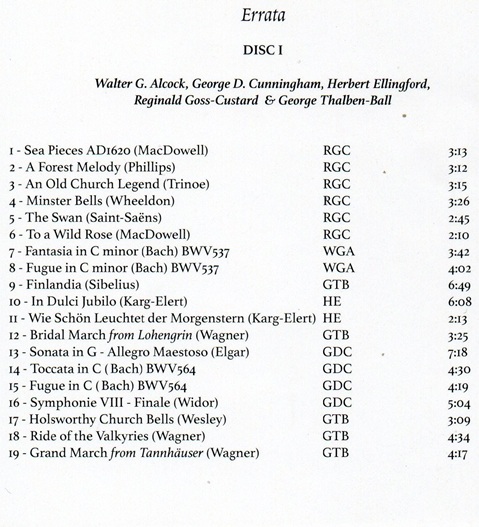 Since 1930, Marcel Dupré has made many recordings, especially at the Alexandra Palace organ in London. It can be heard in works by Bach (Toccata in D Minor [Dorian], Chorales, Sinfonia from Cantata No.29, Prelude and Fugue in C Minor, Prelude and Fugue in E Minor), Franck (Prélude, Fugue et Variation) and Widor (Variations from Symphonie nº5, Allegro from Symphonie nº6).