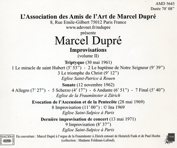 DVD containing 4 TV parts with Marcel Dupré playing and improvising at Saint-Sulpice and at Meudon between 1955 and 1969.