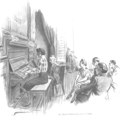 ![]() Marcel Dupré et sa classe d'orgue (dessin de J. Simont paru dans L'Illustration le 29 octobre 1938). De gauche à droite : Marie-Louise Girod, Marcel Dupré, Geneviève Poirier, Philippe Rolland, Jacques Laboureur (premier plan) et Pierre Segond. (Collection : Bruno Chaumet) |